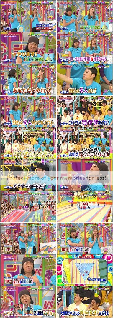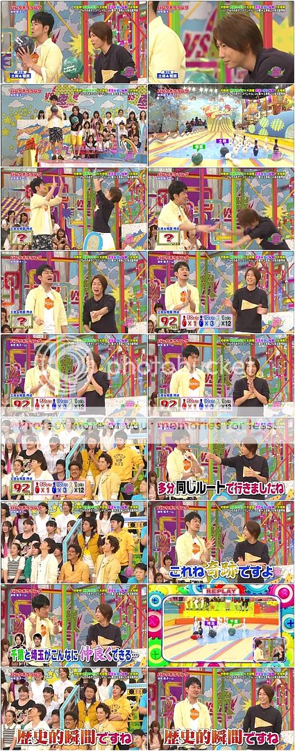 雅紀蹲好低來看方向哦!但是怎麼側顏那麼可愛啊~~果然方向很正確,兩位的球都往同個方向前進,雅紀的球先碰到了紅色瓶子倒了!剩下的瓶子真的不多!雖然沒SPARE很可惜,但是表現不錯!這簡直是奇蹟啊~千葉縣和琦玉縣通常是對立關係的,但是今天竟然合作無間了!真是歷史性的一刻啊!