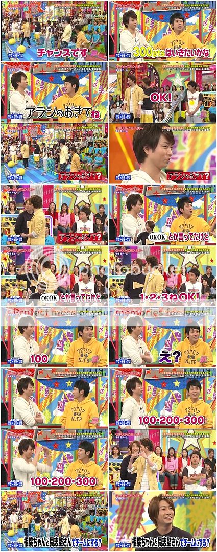 依舊還在落後中的劇組先攻。這裡有小孩子們有想要對嵐說的請求。就是希望嵐隊可以把他們其中的金色球給劇組隊!翔『就知道是這樣的事!』NINO『小孩子都說了,就給他們吧。』(亞撒西!!)潤『我們已經兩連敗了哦。』雅紀『而且這個不是我們得意的遊戲。』翔『福桑我們也還是很危險哦。』福君繼續哀求。NINO『既然如此就給你們吧!』哇!!!!NINO是第一次啊!!竟然不是潤爺讓球啊!!