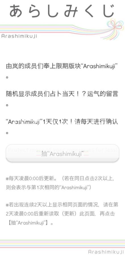 稍微分享一下會員的截圖。是嵐門把自己PRODUCE的哦!每日一次的ARASHIMIKUJI請大家一定要試試看哦!