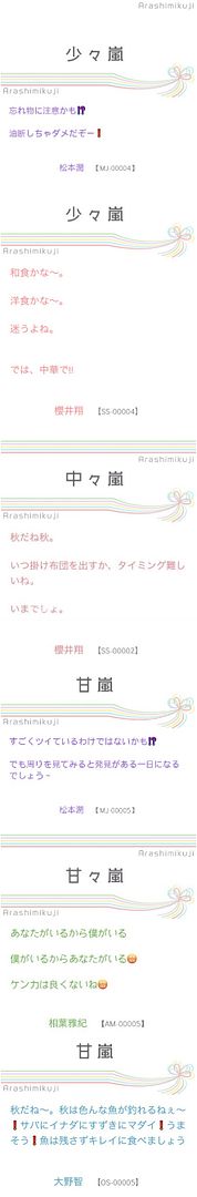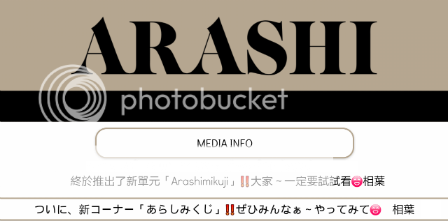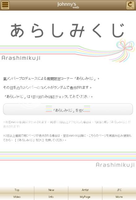 今天官網開設了新corner『あらしみくじ(嵐占卜)』!如相葉桑說的(幹嘛忽然這麼稱呼?)請大家一定要去試試看,是限期版哦!不過……殘念的是……只限J WEB會員,而且一天也只能試一次。好想知道門把個別全部的占卜訊息啊!