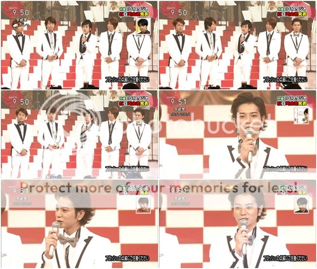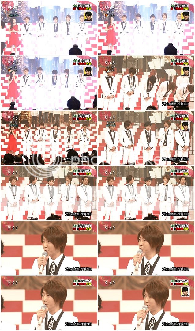 宣布今年紅白司會出場!嵐以一身白色西裝,黑色的外套衣領出現。利達發表我們是今年白組的司會。門把開始打招呼,今年也請多多指教。