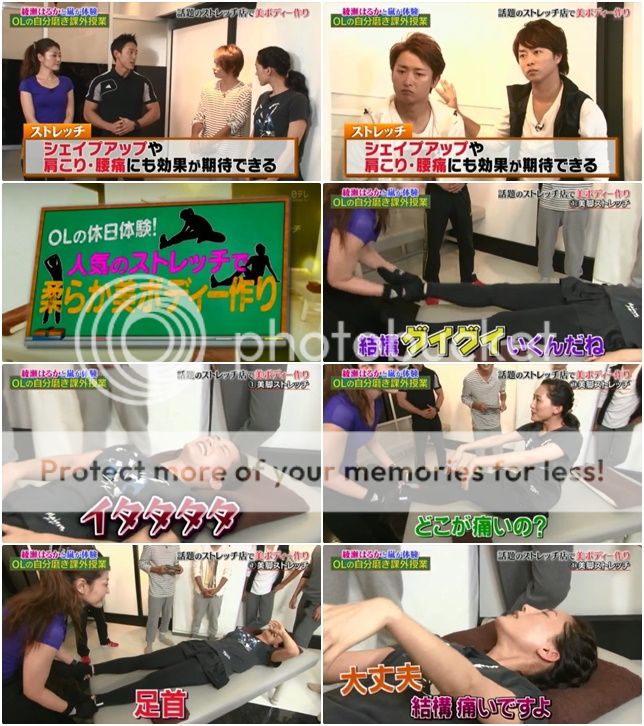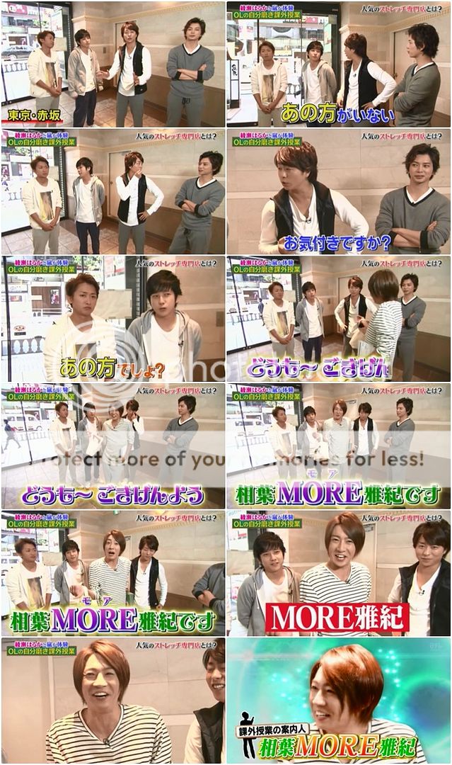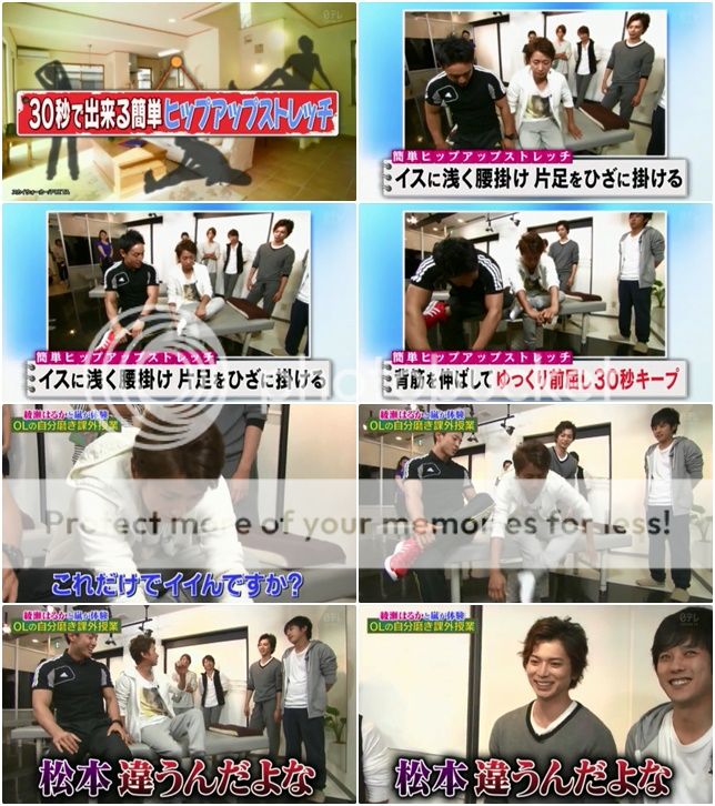 接下來利達示範30秒可以簡單HIP UP(臀部提高)伸展動作。利達翹起他的腳,往前仰的時候,潤故意從後頭壓住利達的背。喂喂!!松潤!利達直接喊出來,知覺就是潤搞鬼。翔還故意幫忙說不是松本哦。你們是小孩子嘛?哈哈哈!