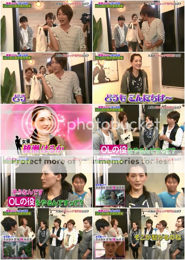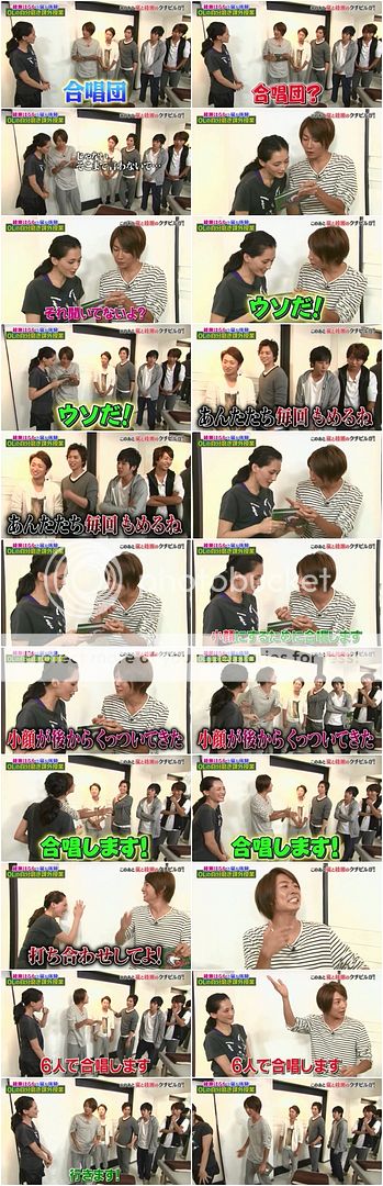 綾瀨醬的番宣還沒結束哦,在做完伸展操後,接下來要進行的是?綾瀨醬『合唱團』誒?合唱團?雅紀就走過去和綾瀨醬順一下腳本。哈哈哈哈!!!你們兩位天然真的是!!!綾瀨醬聽雅紀說明後還說自己沒聽說過這個哦。哈哈哈!門把全部吐槽『騙人的吧!』算了算了,雅紀也放棄了,就合唱團吧。哈哈哈哈!準備來6人合唱團吧!