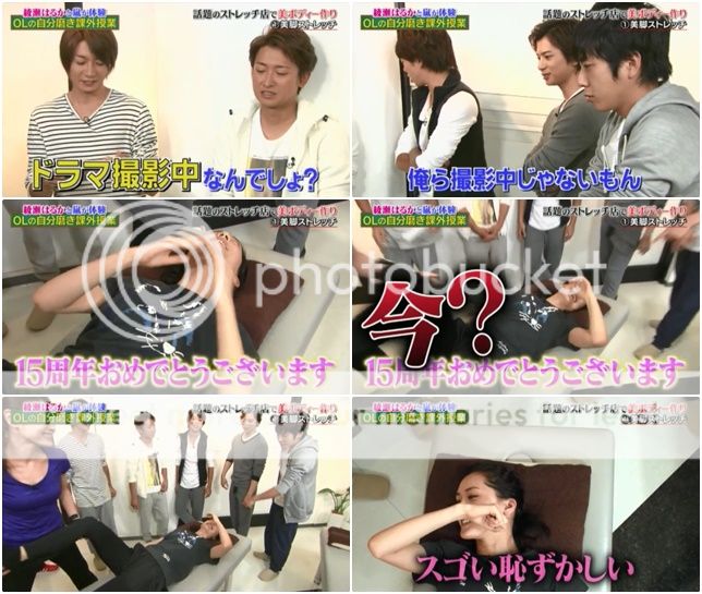 門把圍繞著看綾瀨醬進行舒緩筋骨動作,有點無聊吧,害綾瀨醬都有點害羞了。為了避免尷尬,忽然綾瀨醬就對門把們說『啊~恭喜你們15週年。』誒!!這個時候說?哈哈哈!沒辦法啊,人家想要化解尷尬嘛。這樣大家看著一個女生躺在那裡還蠻奇怪的嘛。