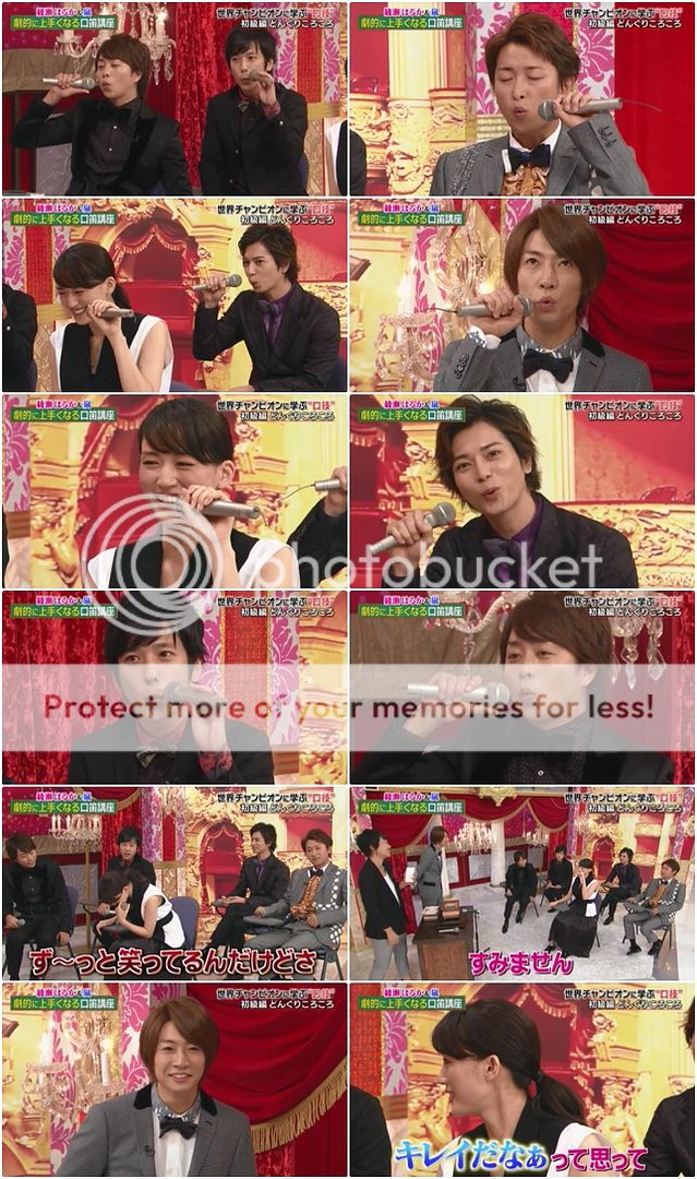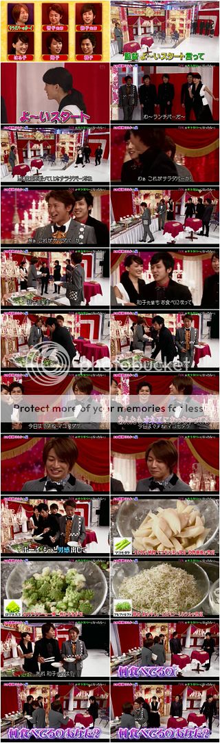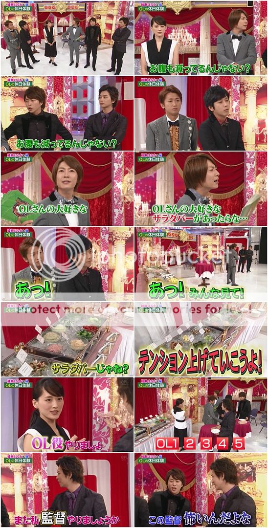 請我們的門把來負責演出小劇場,雅紀負責擔任salad bar的侍應生,利達是智子前輩、NINO是和子前輩(啊!變媽媽的名字了。哈哈哈)、翔是翔子、潤是潤子。整個好女子力的發出好女性的聲音的門把好可愛!!利達整個很胡鬧的說『啊~是salad bar啊~』那請兩位前輩先來吃吧。雅紀就在旁邊旁白說關於今天salad bar的熱門。但是聲音很男性,所以被翔子吐槽了。翔子拿salad時『誒?和子前輩呢?』原來前輩早就拿好salad走到一邊去開吃了。哈哈哈!!雅紀就吐槽『你怎麼就這樣自己吃了起來啊。』哈哈哈!!不是讓前輩先拿先吃的嗎?嘻嘻!!這期實在是好歡樂啊~~太可愛的五子了!