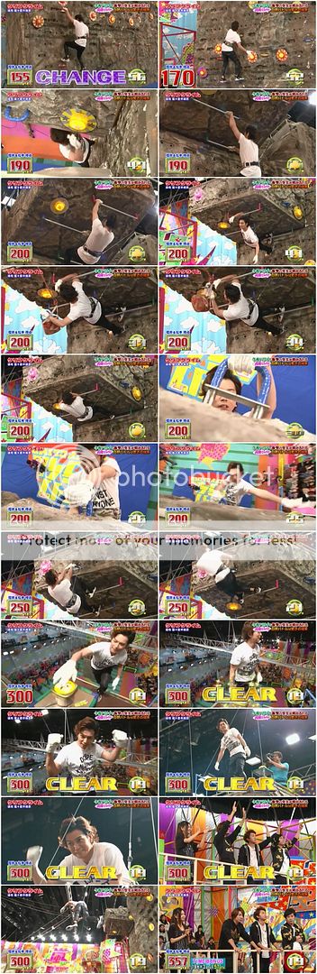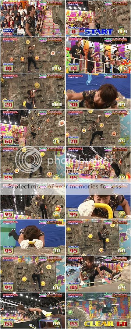 不單是攀頂成功,還有剩下19秒時間拿了bonus分。嵐順利翻盤了!這時候大家都在稱讚兩位,翔gag男又來搞笑了!!大概在松一下手臂的肌肉,一直甩呀甩的。櫻井さんやめろ!!!這樣真的超級醜的,蝴蝶袖都跑出來了!!!!原本伊藤桑cue了潤爺說感想的,怎麼知道被我們gag男把鏡頭搶走了。哈哈哈哈哈!!大家開始笑。嘉賓於是問『感覺在看深夜販售番組(就是那種TV 廣告賣商品的)。』這是新招了嗎翔??你的GAG又要大進步了!!伊藤桑問潤『握力大丈夫?』(連貫了剛剛嘉賓隊的握力梗)。潤就開始甩啊甩他的手臂(學翔的樣子)。不過看看啊,潤爺的手臂是結實的喲!!完全沒有蝴蝶袖,但是翔…………別那樣啦!!!