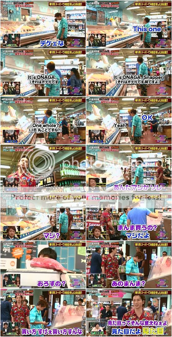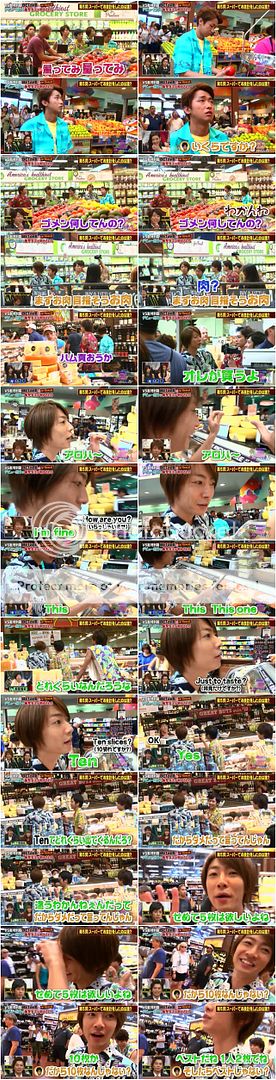 買肉誰來負責?雅紀自告奮勇。首先第一句一定是『ALOHA~』對方問雅紀『How are you?』雅紀『I'm fine。』可是眼睛一直在瞄冰箱裡的肉類了。不錯,不會英語最容易就是指來指去說『This one』就好了!(笑)但是雅紀不會問到底多少錢。店員問是要試吃嗎(Taste?),雅紀沒搞懂以為對方說Ten(十)於是就回答對方『Yes, Ten。』對方就問是要10片?Yes。ok。這樣的雞同鴨講都被你買到肉了真厲害啊!雅紀自言自語問自己『所以10片到底是多少錢?』哈哈哈!在旁邊的NINO就笑說那為什麼不問?雅紀就回答因為不會問。哈哈哈!好可愛的雅紀。但是我覺得可惡的是明明翔就在後面啊,但是為什麼不幫忙問一下啊。簡直是在看好戲嘛你!看你家雅紀買個肉在冒冷汗了。笑。雅紀說10片剛剛好,一人可以吃兩片。真是溫柔體貼的baby啊!