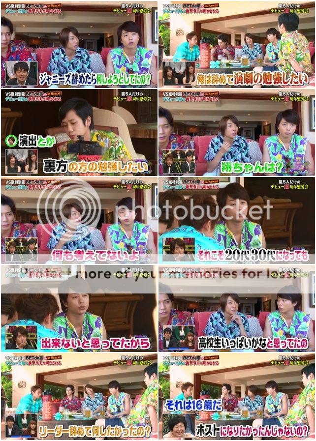 那之後翔就有想退出的想法了,NINO得知翔有這個想法也有想退出的想法。當時在去夏威夷之前,大家都先去了LA,當時就只有利達,雅紀和自己,三個人還睡在同一間房間。那時候出道的台詞就送來了,瞬間潤就有點徬徨了。