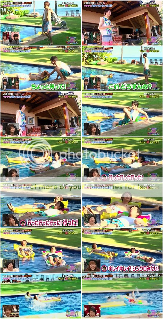 竹馬開始要來玩鬧了!!簡直就是兩位小朋友啊!!一起躺上去浮在水上好可愛啊!!然後雅紀當然不可能乖乖的這樣度過,一定要來胡鬧的拍水,然後還一把翻了NINO的那個浮板(?怎麼說啊?忽然忘記形容詞了),怎麼知道自己的也翻了。哈哈哈!太可愛了!!兩人掉進水里,一直拼命喊『水好深啊!』快笑翻翔了!!