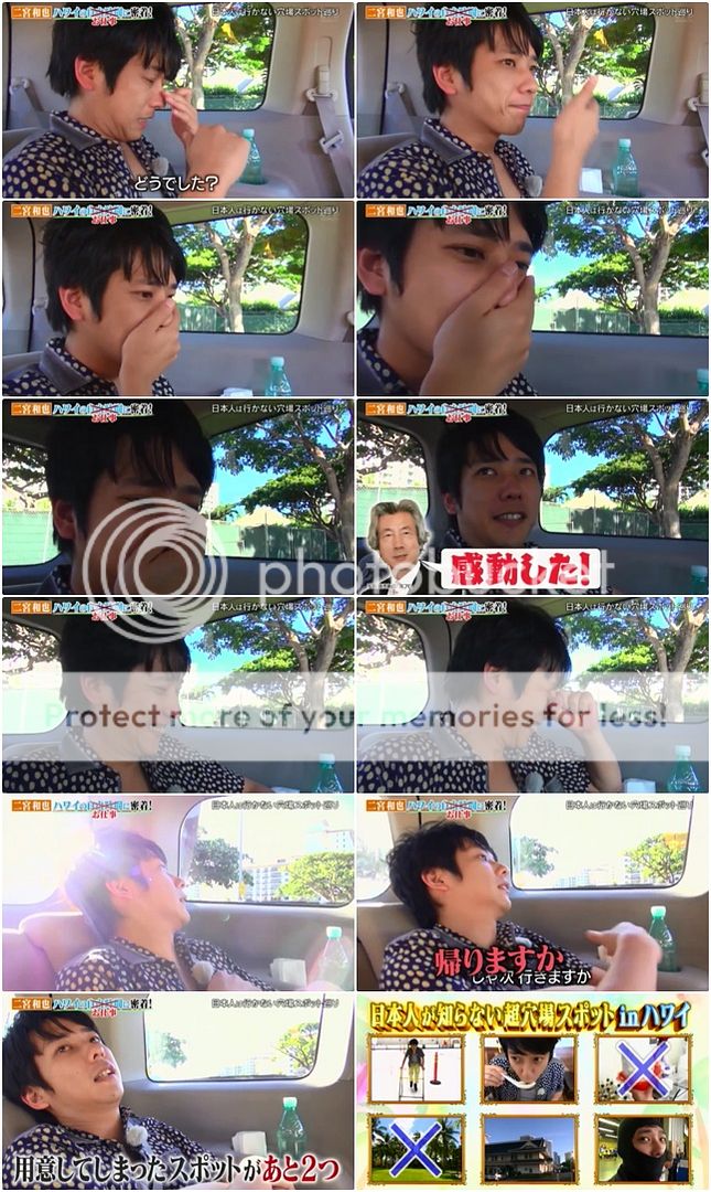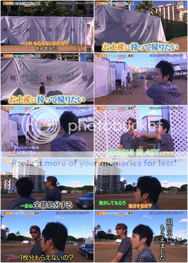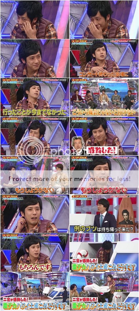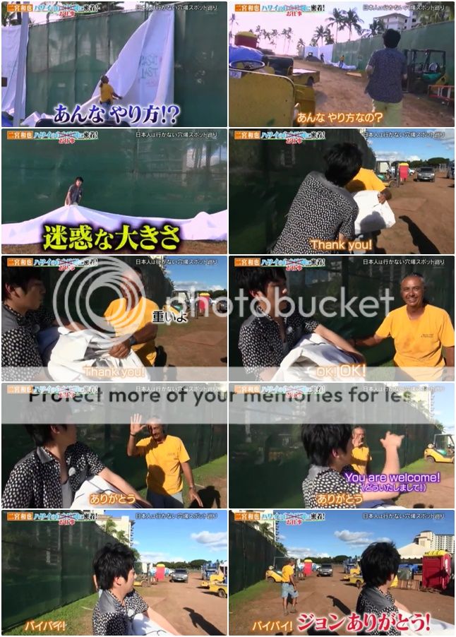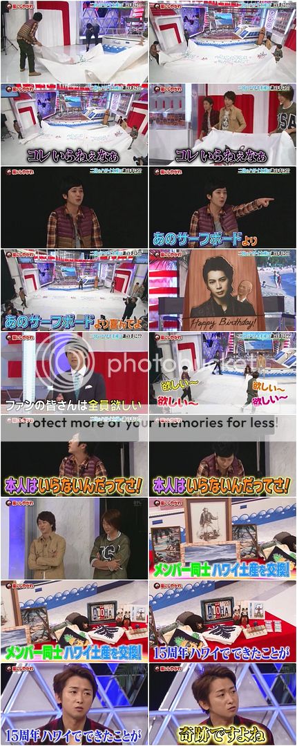 最後來看NINO遠從夏威夷帶回來的伴手禮吧!就是那塊超大的夏威夷橫幅!!我超級想要的啊!!但是明顯門把都不是很領情啊。MASU桑就問現場的觀眾有沒有想要。大家都和我一樣嘛!!超級想要的啊!NINO就說對吧,本人卻不要!NINO不甘心的說難道收到那塊衝浪板有比較開心嗎?哈哈哈!別這樣別這樣,兩個人的禮物對你的J都非常好喲。哈哈哈!