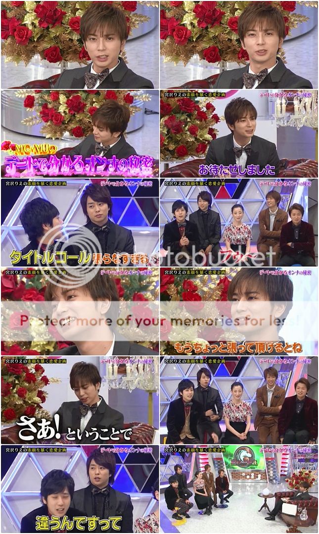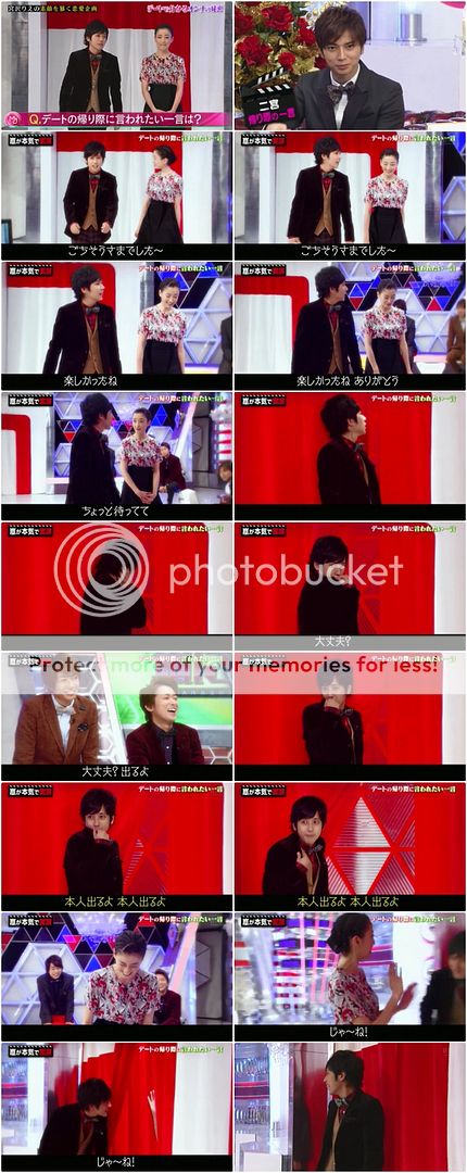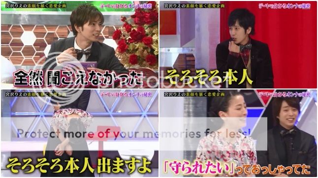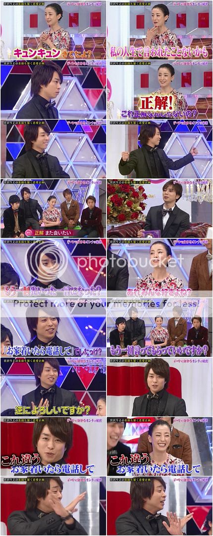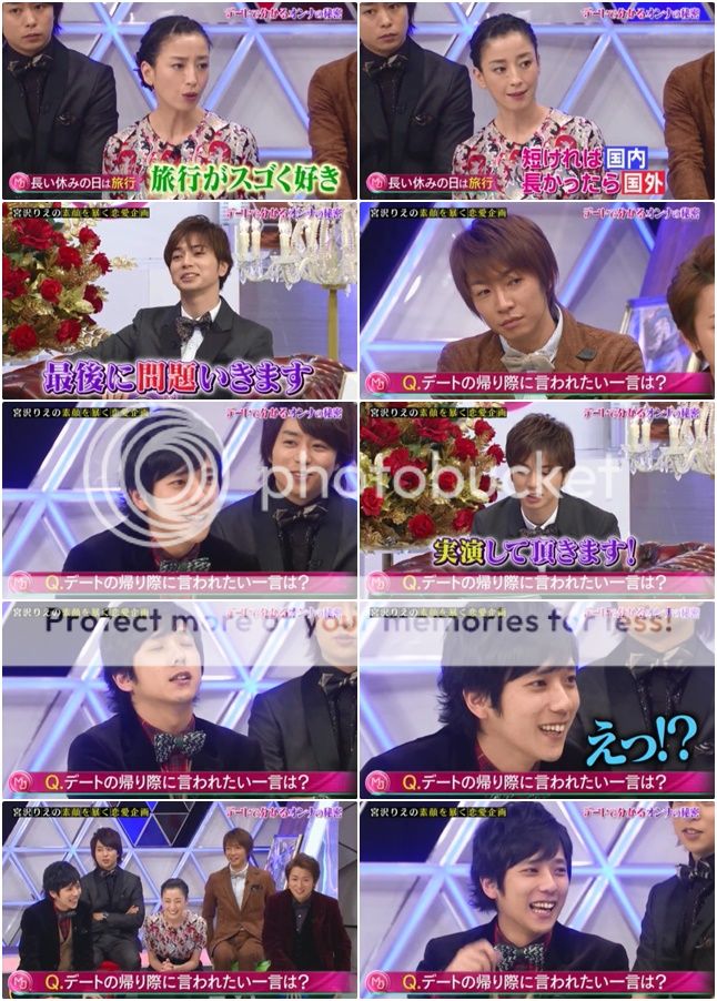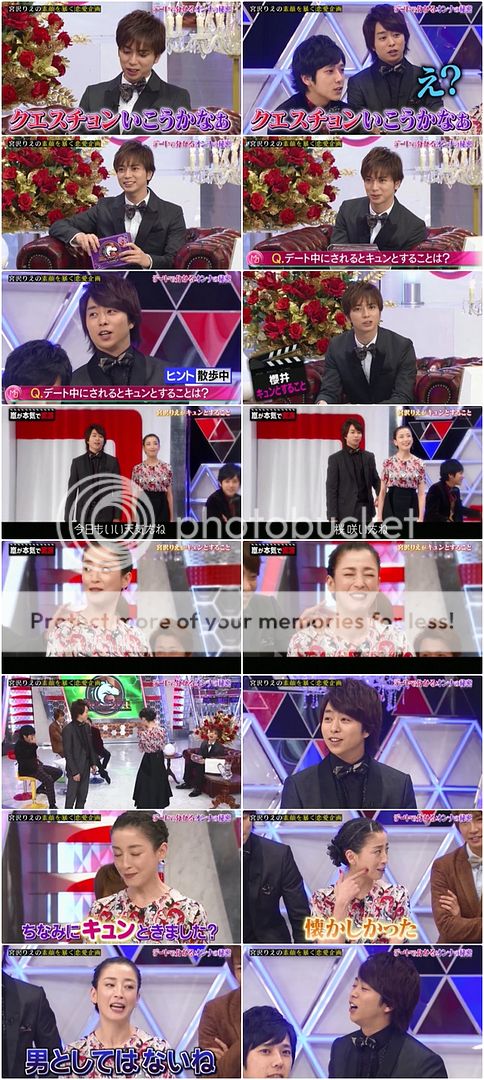 潤忽然說要出題目。誒?有quiz?要用表演的方式來猜測宮澤會被怎樣的動作心動?首先是散步的場景。翔來示範。翔竟然忽然就走到宮澤桑後頭,叫住她然後戳了人家的臉頰。很明顯這個不是正確答案。