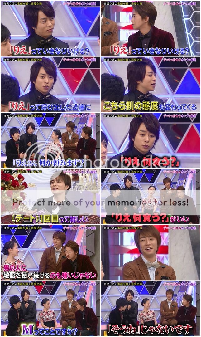 利達說他做不到直接稱呼宮澤桑的名字,如果是翔君應該做的到。翔其實也為了要直接稱呼宮澤桑名字而有些猶豫的,果然還是因為要經過一起合演變熟悉後才能做到啊。潤就說果然第一次見面很難做到直接稱呼名字啊。不過宮澤桑不喜歡男生對他用敬語。利達就毫不客氣的問『宮澤桑是M嗎?』喂喂!不要那麼直接。宮澤桑還回答『是。』NINO就吐槽不要說是啦。