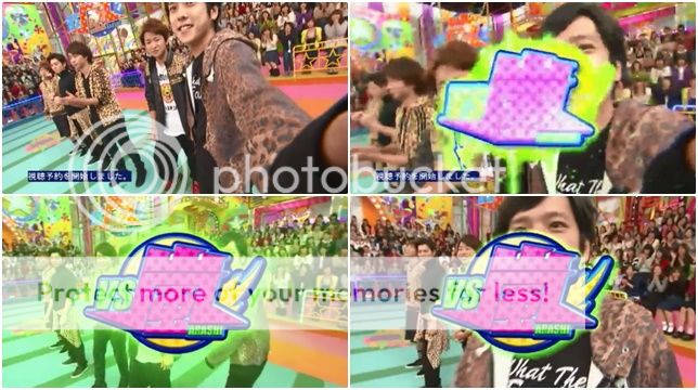 再來是今晚的PLUS ONE GUEST。原本兩位還在升降台升起時在轉圈圈,潤都看不清楚他們是誰,不過NINO倒是看的很清楚嘛,已經開始在笑了。櫻葉在另一邊也笑了出來。今天的PLUS ONE原來是感情很好的兩位オネエ(ONEE。男生扮女生,還真不知道要怎麼用好的形容詞說。哈哈哈!)