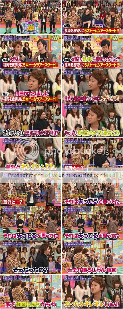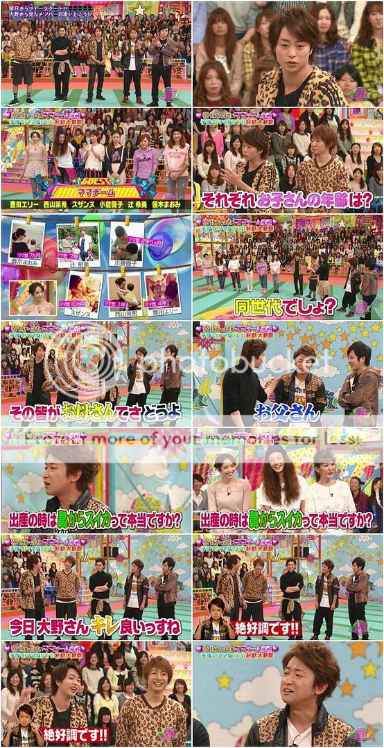 請出對抗嘉賓,今天是媽媽隊!翔就依序的問了各位媽媽的孩子今年的年紀。然後潤不知道怎麼的轉身拍了拍利達的肩膀。利達就問媽媽們『生孩子真的就像把西瓜塞進鼻子那樣(痛)嗎?』哈哈哈哈!!!翔就轉身看著利達『今天大野桑的問題真是好啊。』哈哈哈!今天我們利達馬力全開了呢!