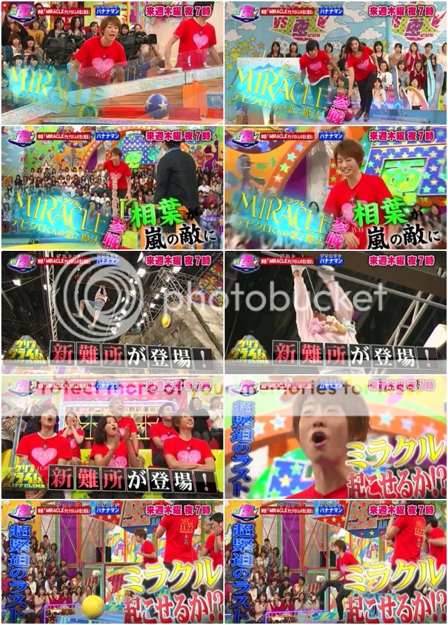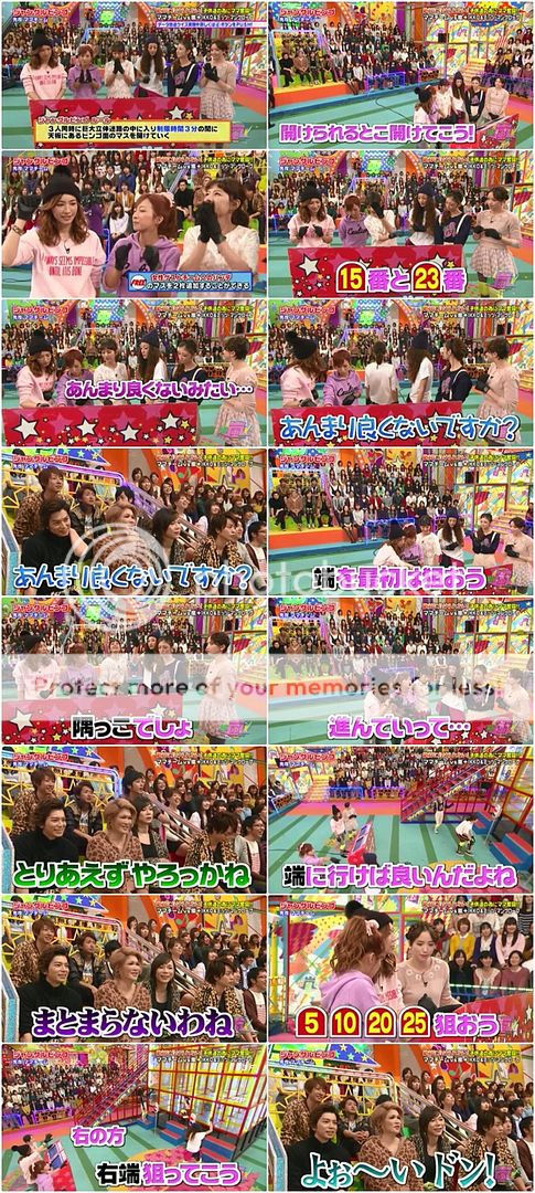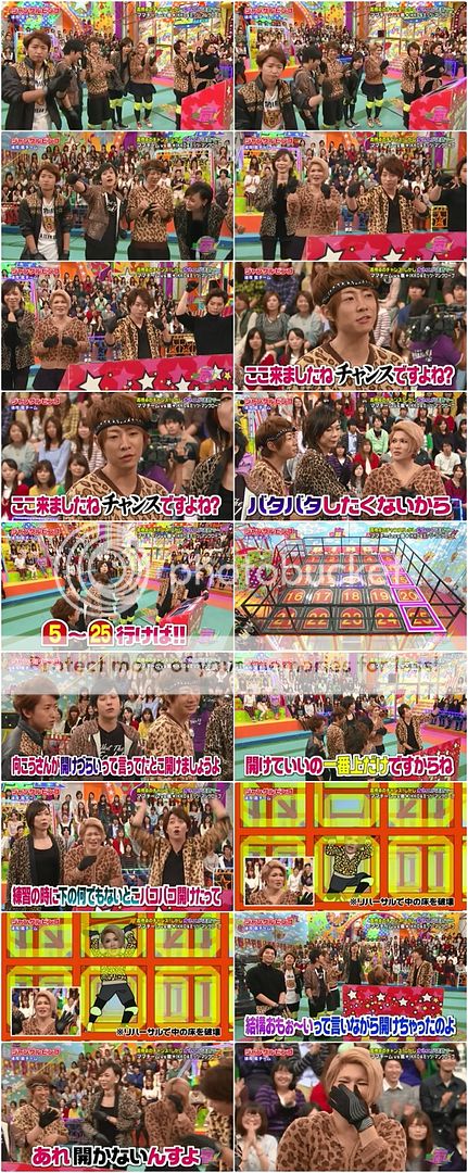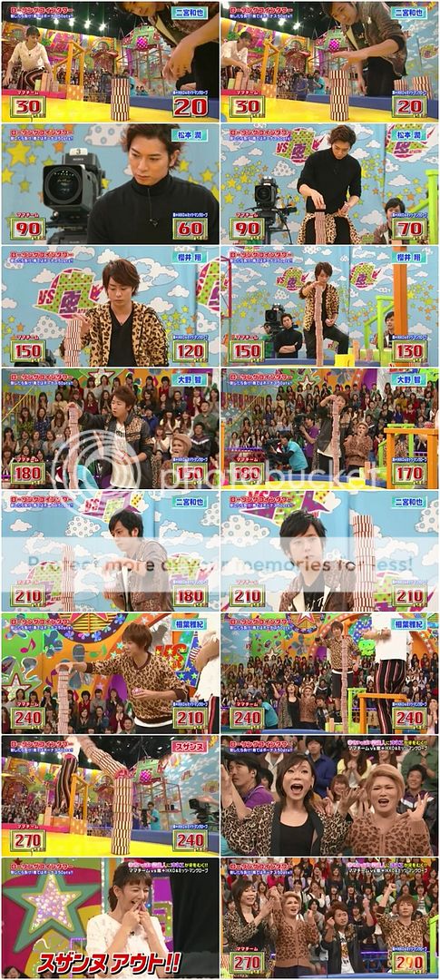 上吧!嵐!雅紀無敵啊!!人瘦瘦果然很輕盈呢,直接從格子一個跳躍出來好帥氣喲!末子動作整個很快速!兩個都是一眨眼就開格子了!潤BINGO了!殘念的是…………都輪了幾個人但是IKKO桑從第一輪都還在裡頭轉圈圈一直到利達進去,他才引導了IKKO桑出來。整個1分45秒都在迷宮裡迷路啊!!而且還兩次都碰到利達才夠爆笑!利達還真是引導的好呀!