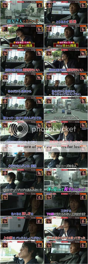 雅紀解釋當天剛好也碰到風間的休息日,於是雅紀就問他說願不願意一起上《夜會》鏡頭,他也答應了,然後稍微有策劃一下一天行程。有吉桑就吐槽說原來是有安排的啊?還真是無聊的行程。哈哈哈哈!!!因為一直在移動嘛~車裡的時間太多了。翔自己看了都疑惑的說『播出這樣泡湯的鏡頭真的沒問題?』(ふふふ,你是真心這樣問,還是私心的問啊?)說實話,翔看了都有點嚇到。