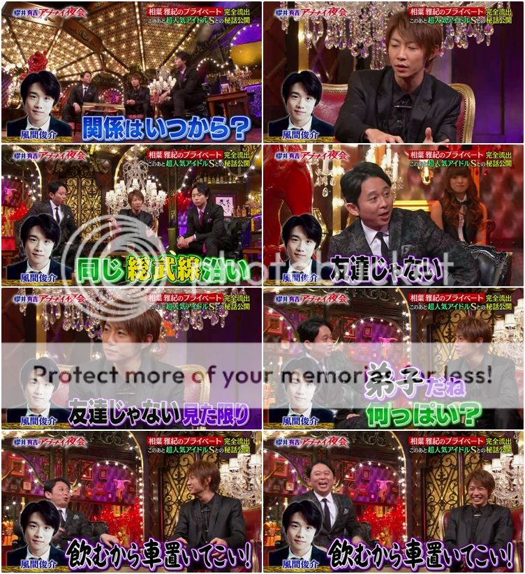 翔問雅紀和風間的關係從什麼時候開始的?雅紀於是就解釋說以前還是事務所的學習生時就一直和風間是同一條回家的路(總武線),所以會一起吃飯什麼的才回 家。有吉桑『但不是朋友吧?風間。』雅紀『怎麼說?』有吉桑『是弟子吧。(就是跟班意思嘛)』噗!絕對是的有吉桑SPOT ON!翔也頻頻點頭贊同。去喝酒還得風間先開車回家這點就夠證明了!