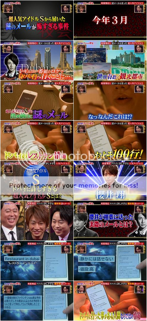 而另個就是超級S的偶像發送給雅紀的神秘MAIL恐怖事件!!就在今年3月。當時雅紀因為另個番組到了杜拜去拍攝。某天意外的收到某人傳來的簡訊,而當時打開時,雅紀就被內容嚇到了。因為那個人給他傳了滿滿杜拜好吃好玩的訊息,這樣的mail竟然長達100行!mail已經細節到哪間店什麼好吃,氣氛會是如何,什麼是推薦要吃的。我說櫻井翔,除了你我真的想不出會有人能做到這個極限!噗!!只能說雅紀你是被疼愛的啦。