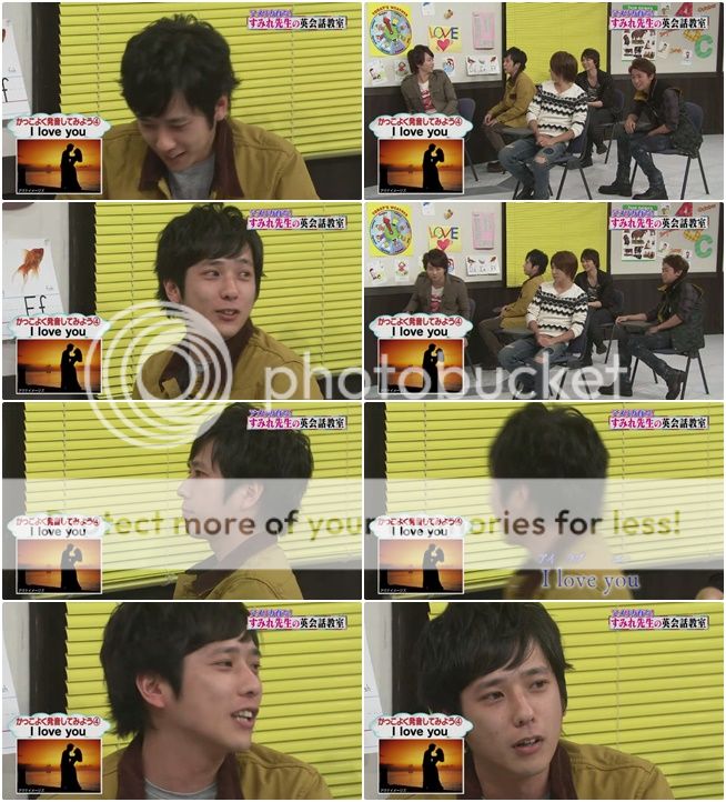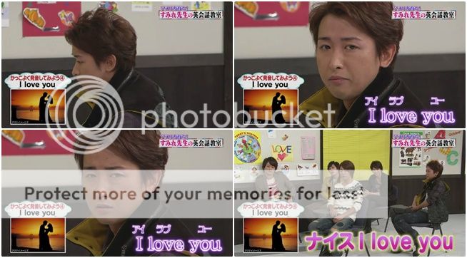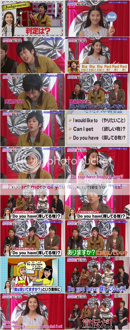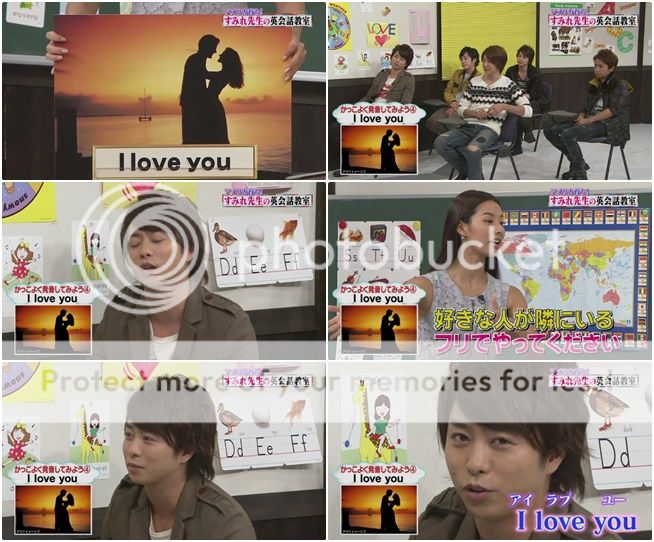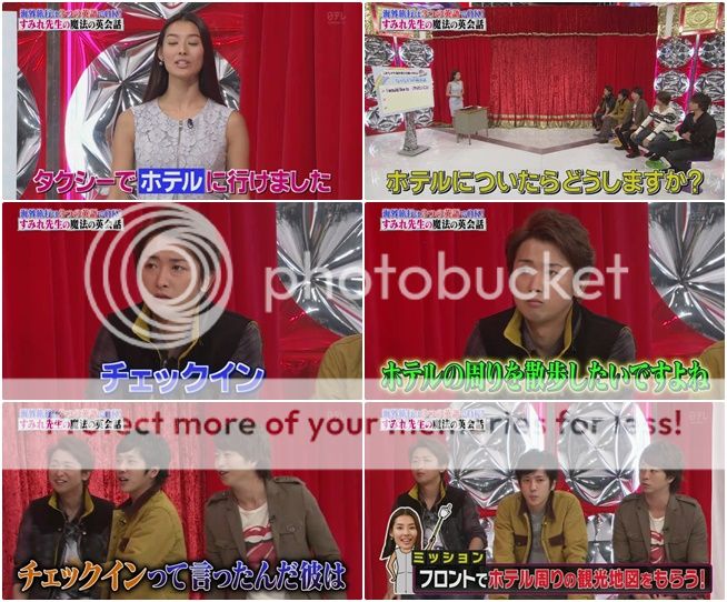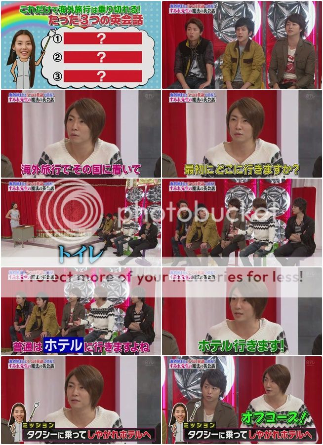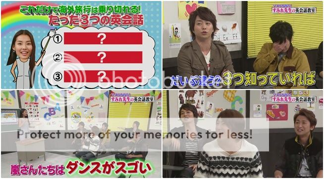 今天先生要來教導大家出國玩最基本的三個英語詞。翔疑惑只需要三句詞嗎?三句都害我們家NINO寶貝在後面戳眼睛了。壓力好大。哈哈哈!先生說其餘的可以用肢體語言來輔助,因為嵐的各位是跳舞很厲害嘛。這好像和跳舞沒什關係哦先生!