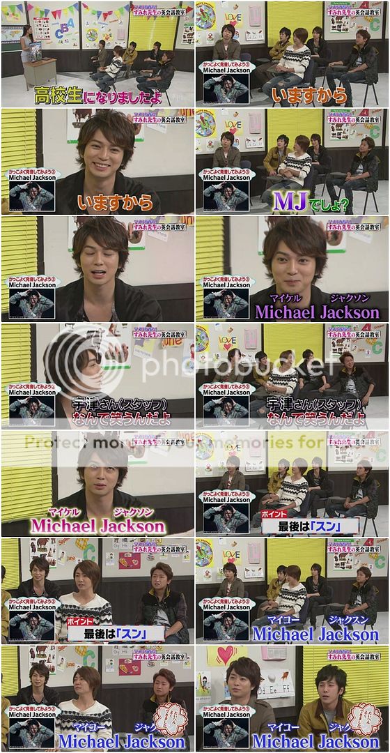 現在要進行到高校生程度了。出現了MICHAEL JACKSON的圖!!NINO『我們這裡有!』潤笑了出來。雅紀『MJ對吧?』於是請潤來發音看看。說完,旁邊AD桑笑好大聲被潤槍了,人家可是很努力哦,不准給我笑那麼大聲!哈哈哈!