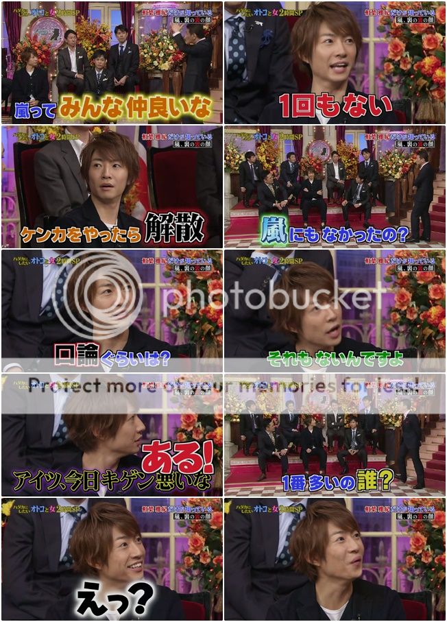 MC說在大家的印象裡,嵐感情真的很好啊。(是真的喲!)MC問那真實私下有沒有打架過?雅紀很驕傲的說『一次都沒有。』說不定如果真的吵架鬧意見了還真的會解散了(之前NINO在007有說過)