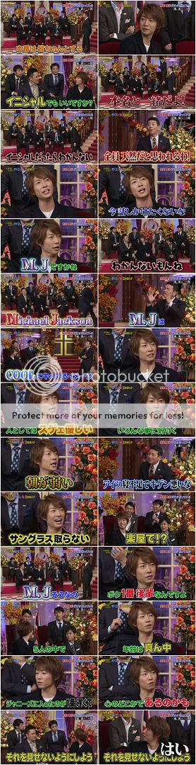 那最常這麼想的是誰呢?雅紀『誒?』哈哈哈!!不要害我們家雅紀嘛~雖然我也很想知道。雅紀問那可以只說暱稱嗎?哈哈哈!!門把都是用本名啊,有什麼好暱 稱的!!絕對還是知道的呀!!MC吐槽雅紀『暱稱我們就不知道吧?』雅紀『嗯暱稱就不知道是誰。』MC『是當我們全部都是天然嗎?』噗!!雅紀最後回答的 那個人暱稱是………………『M.J.!』哇哈哈哈哈!!!現場全部大尖叫。雅紀啊雅紀~~~MJ不是你最常用在某位門把身上的暱稱嗎?這還算暱稱嗎?哈哈 哈!!我們大家都知道喲。MC們好配合的說『我們不知道是誰哦。』『是MICHAEL JACKSON嗎?』雅紀回答『不是哦,是MICHAEL JORDAN。』噗!!怎麼有越描越黑的感覺。