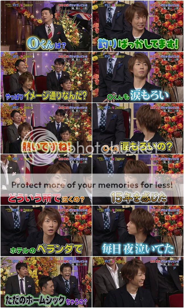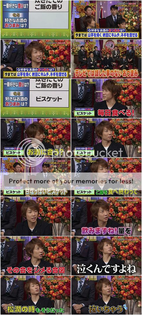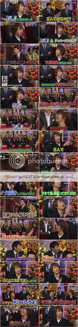 11/3那天是嵐的專輯出道日,剛好11/2晚上五個人在一起(就是去看TOKIO大哥20週年控嘛),於是之後雅紀就和松潤(喂喂!這不是把名字說出來了嗎雅紀~)和其他人一起去喝酒了(原來還有其他人)。2人用到桌子就是類似截圖裡的那個這麼小。雅紀當時有點不知道該說些什麼,但是喝著喝著就哭了出來因為想到嵐到目前為止都一直很努力啊。MC就吐槽雅紀說『然後還告白說喜歡他吧。』雅紀立刻搖頭說才不是才不是(小心翔在看。哈哈哈)。後頭一位MC就問『後來有擁抱接吻嗎?』雅紀說後來兩人都哭了,然後別桌的Jr們走過來起哄讓兩人親親,自己也不清楚但後來好像真的親親了。(嗚啊!!!!!不要!!我不要聽!!翔,別哭~~)這話不能說吧!!潤肯定會念你了啦!!之後還是控……雅紀你自己保重。哈哈哈!
