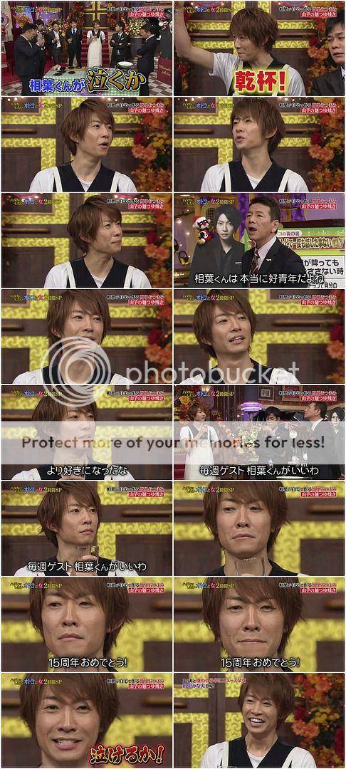 最後請相葉以哭泣來收尾。於是雅紀努力的和大家乾杯了,然後MC們一直拼命稱讚雅紀想讓雅紀感動落淚,甚至說相葉君真是個好青年啊,真希望每期嘉賓都是他。恭喜15週年!雅紀真的很努力想哭,但是最後爆出『這麼短時間哭不出來啦!』笑。