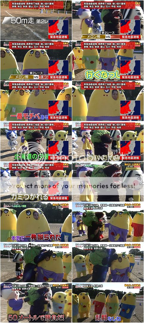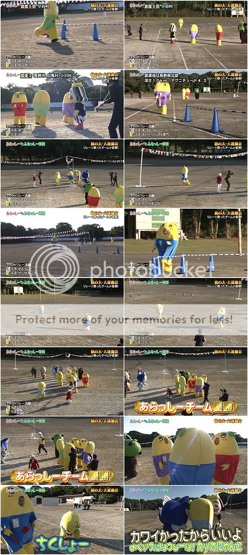 嵐的體力還真是不錯啊~~~!穿這樣都還能勝出。今天ふなっしょー的氣勢還真不一般。哈哈哈!因為接力賽跑是2分,於是最後是由あらっしー軍團獲勝了!