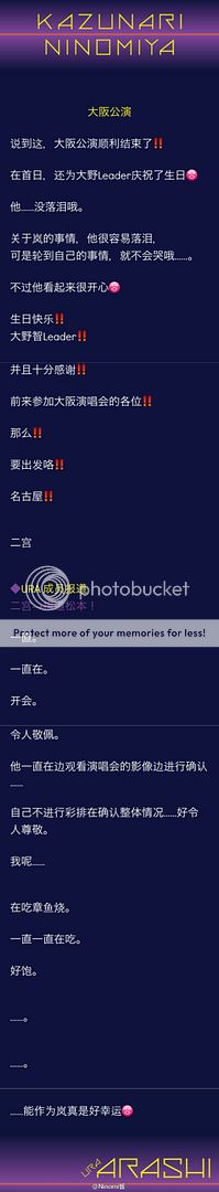 福岡場的URA ARASHI忘記來分享了,請大家上官網去看。因為剛好碰上本週J WEB是NINO,那就一併把他的大阪場報導和他寫潤的URA ARASHI一起來分享。