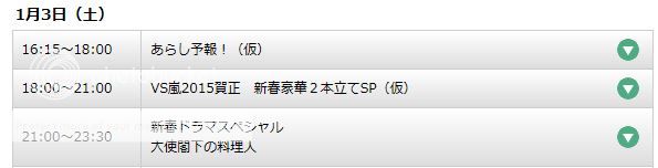 最後是新年大家最期待的番組SP!今年不叫被盧嵐,而改為ARASHI預報。再來就是連接了VS嵐3小時SP。最後當然就是來上我們料理人的新春劇咯!!好期待啊!!!!