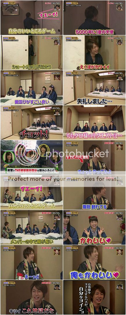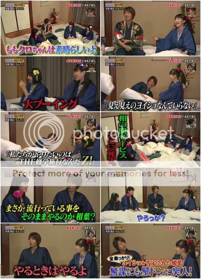 就像個大哥哥一樣坐在五個小女生中間。看的當下就一直自言自語說雅紀好可愛啊!!雅紀好敷衍的說了モモ們很厲害,但是又說不出厲害的點是什麼,於是被五個女生用枕頭丟他。一團混亂啊這裡。於是粉色モモ說了今晚的要求就是最近很流行的壁ドン,而希望雅紀對她們做。