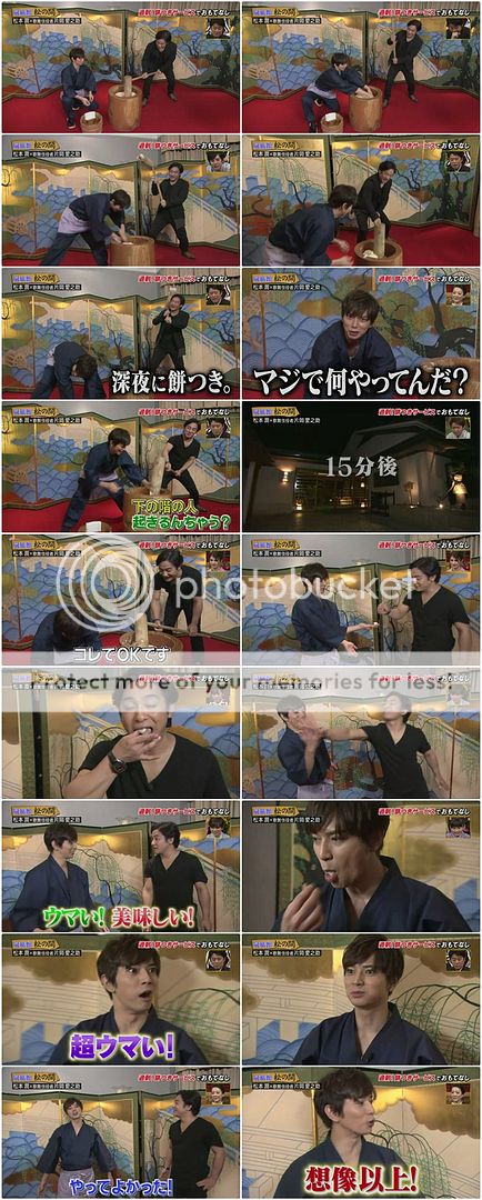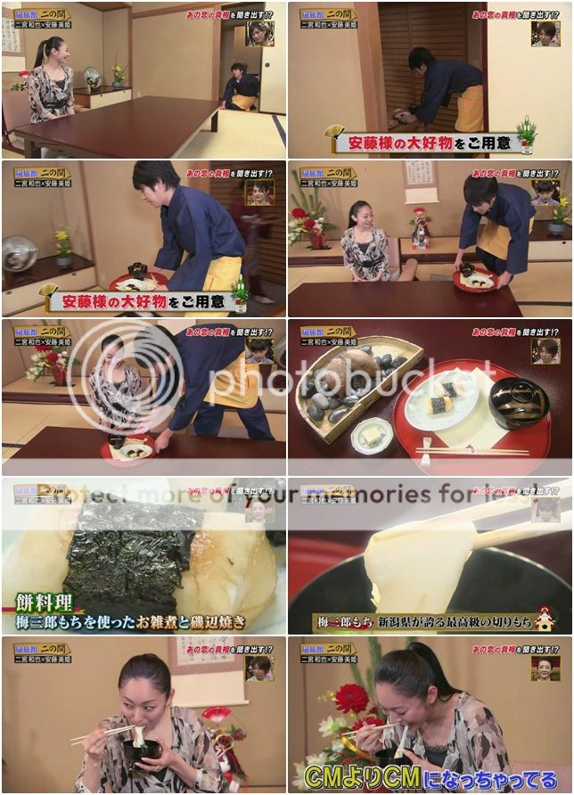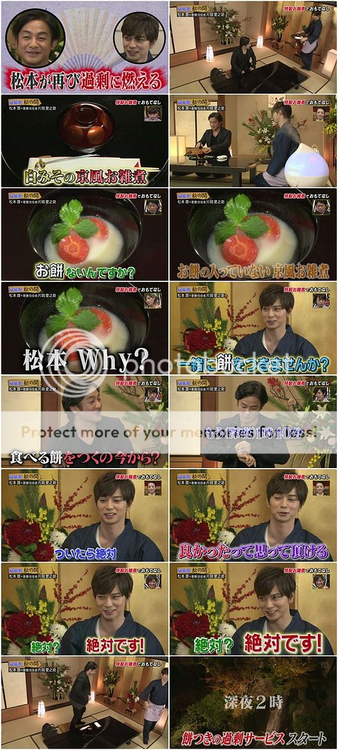 片岡桑的要求是喜歡吃京阪地區的新年食物(年糕之類)。而潤也為他準備了,不過打開那個碗,裡頭竟然沒年糕。沒想到潤是要片岡桑和他一起來製作年糕。天啊!!深夜時刻竟然要嘉賓和你做年糕!!還那麼信心的說絕對要親自做比較好吃。