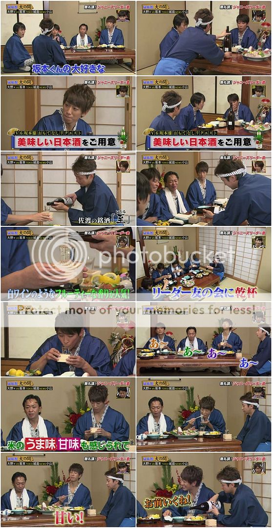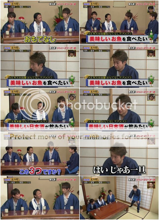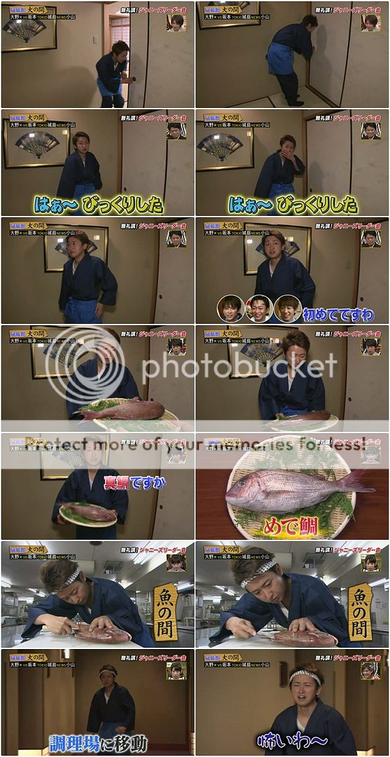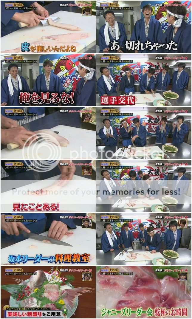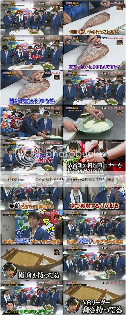 在三位利達面前處理魚一定很有壓力,尤其我們坂本桑可是在某個新聞番組裡有自己個人烹飪單元啊(PRO級的啊!妮可偶爾也會看一下。)但是我們家利達一點也不遜色,把魚的頭切下來也切的非常漂亮呢。各家隊長問利達說平時會處理魚嗎?利達說自己釣的就會自己處理。坂本桑太可愛了!!說因為喜歡自己處理魚,還有吃生魚片所以竟然還去買了那個擺生魚片的木船裝盤!!!於是城島君就笑說他家的山口君是買了自己的船,而V6的隊長則是擁有自己的“船”。哈哈哈!!
