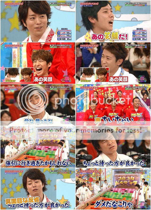 開始了!!!討厭啊,每次到總決賽,番組都是播那個超級緊張的音樂,不是平時那個歡樂的BGM。NINO真的一開始很小心,但是差不多三週開始他也無法忍耐了,開始進攻,每個都是放超級歪的,台下門把也都看的很入神很緊張。最後NINO再次進攻的放歪後,到了中田桑那裡時就倒了。耶!!!!!!!!!我們嵐獲勝了!!!!!!2015年絕對會是個無敵順遂的年!!!!大家歡樂的擊掌!!