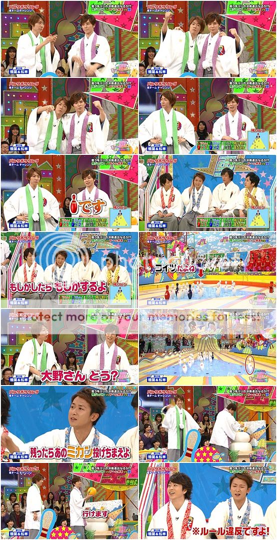 兩人的球很完美,也沒碰在一起,往兩側去,掃了旁邊好多的瓶子。這樣其實是好的!!如果接下來的夥伴可以往中間打那就非常完美的有機會spare了。分數165,算第一棒沒中紅色瓶子很高分哦。潤問但是兩人都是往中間方向打呢,是在瞄準什麼瓶子啊?NINO『藍色哦。』(噗!就愛狡辯)。但是台下門把全部不相信。最後NINO說『好啦,是紅色。』哈哈哈哈!!!好可愛!!!!!