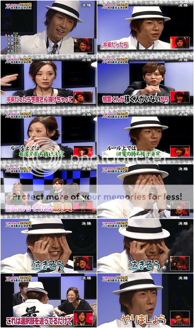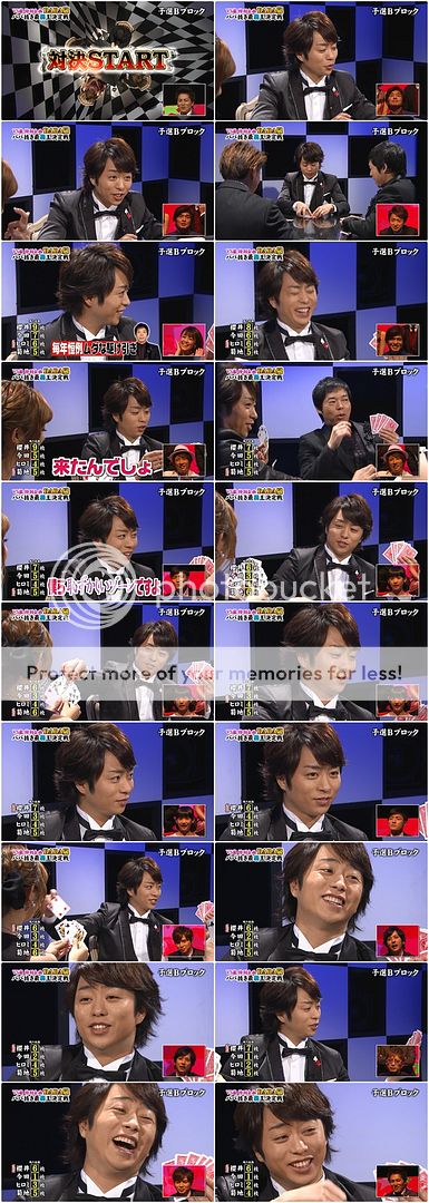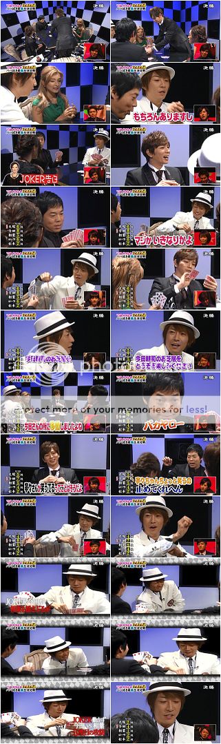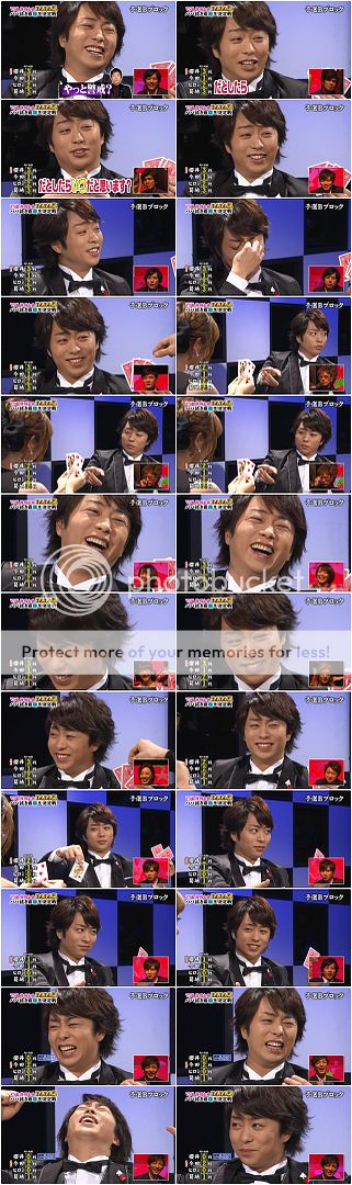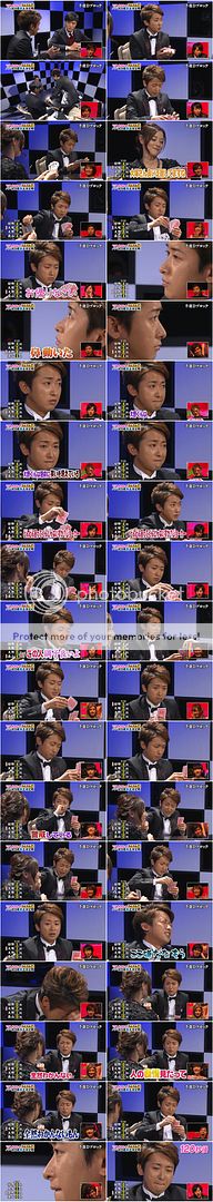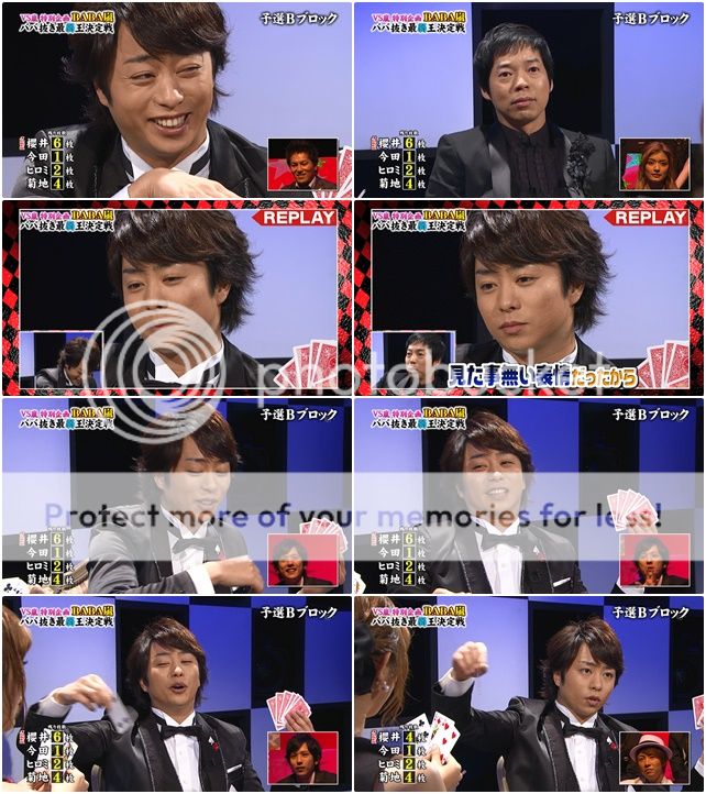 雅紀雖然脫手了鬼牌,但是其他牌也一直不pair他又開始嗚啊~了。最後ROLA先脫手全部的牌。然後在大塚桑把鬼牌從潤那裡抽走時,潤表情好可愛啊!!忍耐著要笑,就一直捏自己的眼皮是怎樣。NINO就小窗口裡解說是因為現在他很安心了。至少剩下這麼少牌機率也很小會回到潤手裡了吧。