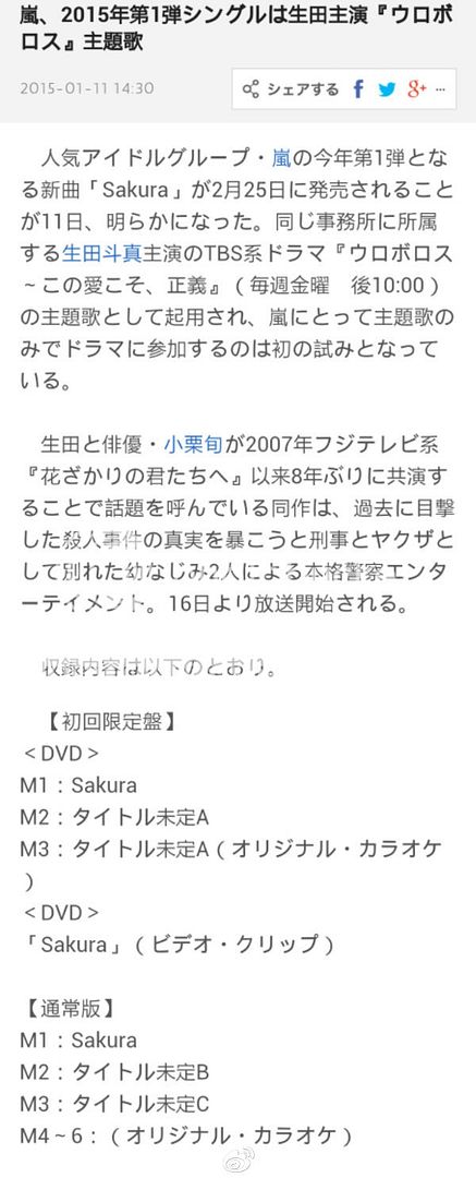 2015年第一首單曲是TOMA君的新劇『ウロボロス~この愛こそ、正義』的主題曲「SAKURA」。