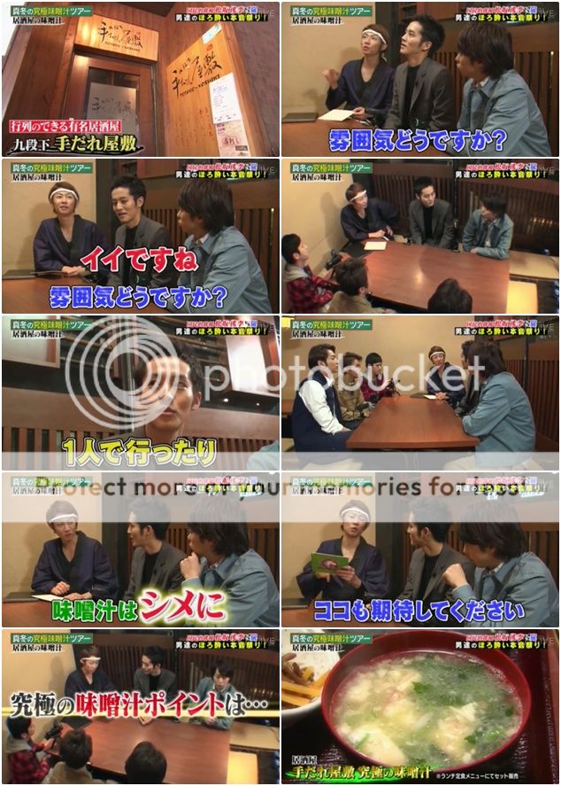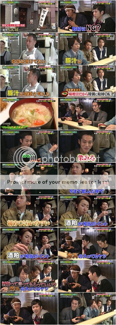 這家炸豬扒店一直以來都不被拍攝的,奇怪今天怎麼會這麼大方讓shiyagare來拍攝啊。不過如果是拍攝味增湯那店長就沒問題。這家店的味增湯真的看起來好好喝啊!利達也說是到目前為止第一次喝到這麼好喝的。模特整個害我笑翻了這裡,難怪翔笑的那麼開心。明明潤說這個味增湯好喝的秘訣是酒粕,雅紀就回答說就沒喝過放渣進去的。NINO就吐槽說雖然是很能理解雅紀想表達什麼,可是這個說法也太……XDD