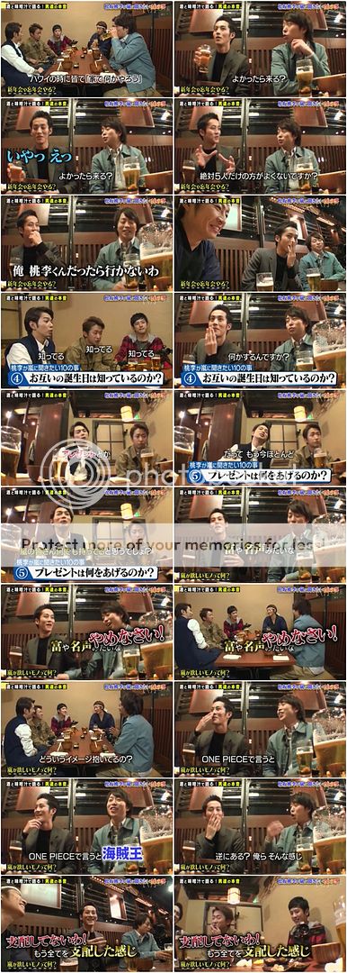 接下來桃李桑問五人說門把互相生日都記得嗎?大家都是記得的。而會做什麼來表示?潤『會送禮物。不過說是想送禮物可是互相都覺得大家什麼都有了。』桃李桑就好好奇想知道彼此會送什麼禮物因為聽說嵐很富有嘛。翔『請別這麼說了。』哈哈哈哈!!怎麼會對他們有這樣的印象啊。桃李桑說感覺嵐就是要什麼都可以支配的感覺,就類似ONE PIECE海賊王那樣。哈哈哈!才不是這樣啊!