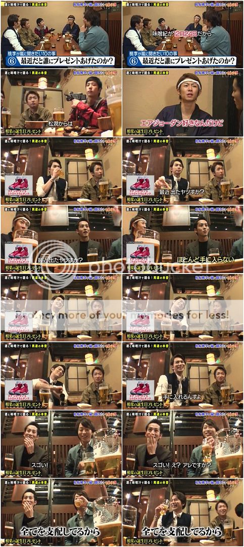 那最近是送誰禮物?那就是味增紀12月24日的吧。雅紀說松潤知道他喜歡MICHAEL JORDAN就買了一雙非常限量的球鞋給他。桃李桑『是那個最近剛發行的嗎?』就是那個呢,潤很洋洋得意。桃李桑『啊!那個好難入手的啊!』潤更加得意的拍了自己的手表示自己很拿手。桃李桑『好厲害啊!所以說就是那樣吧?完全可以隨意支配了。』哈哈哈!