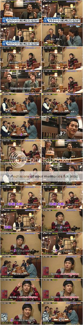 於是NINO就解釋為何潤的稱呼那麼特別。因為潤比NINO早一個月進事務所,雖然歲數是一樣的,也沒有其他人是這樣早一個月的前輩(潤:是沒有呢),當時NINO進事務所時大家已經在稱呼潤『松潤、松潤』了所以NINO感覺錯過了稱呼他松潤的時間點。而因為當時NINO在看某本漫畫【魅!男塾】而裡頭某個轉學生的眉毛非常粗名就叫J,很帥氣,所以當時候就聯想到了潤。