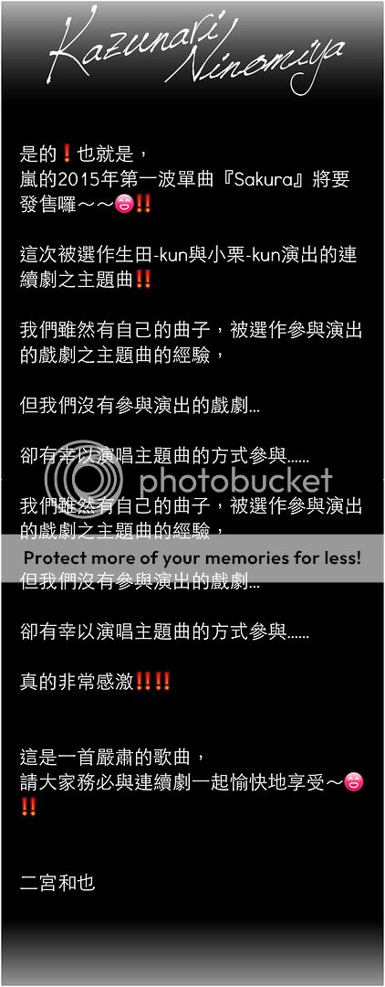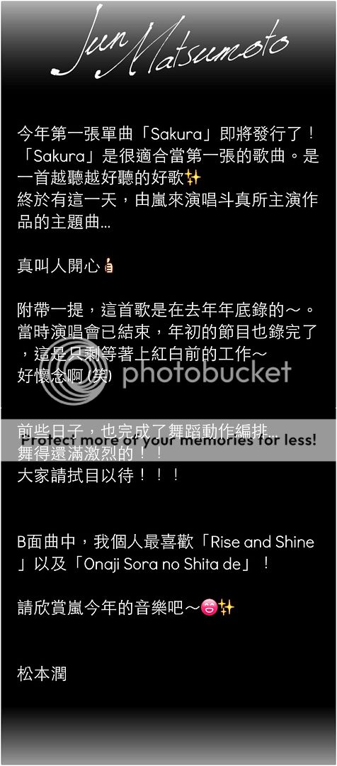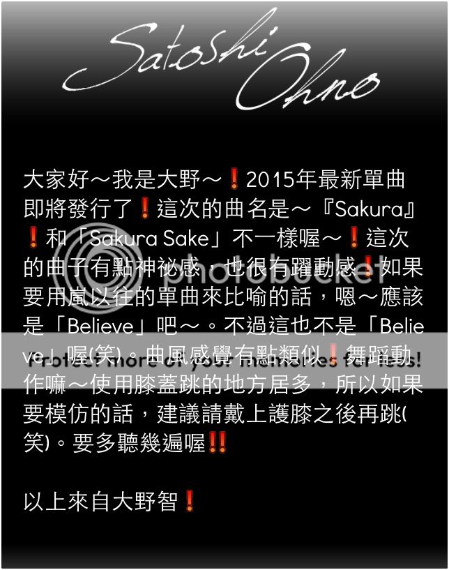 每次看特設網站就有種單曲終於要發布了!!這次大概是因為TOMA劇已經上一個多月了所以變成我們看劇就會一直聽到單曲BGM,再來門把的電台都一直在播SAKURA所以感覺這次等到單曲出來我們全部都對這首主打超級熟悉了。就期待其他的coupling歌曲了!尤其門把介紹的幾首歌曲。
