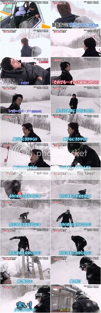 不過番組給翔配了那個LET IT GO的BGM太適合了啊!!雖然歌詞說什麼不會冷,但是實際上翔大喊『好冷啊!!』好好笑!!終於終於,給翔走到了泡湯的地方啊。