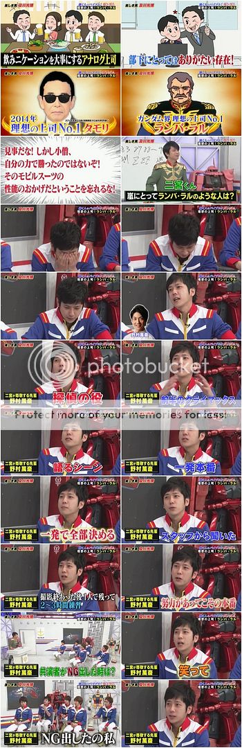 話說另個在GUNDAM裡的角色是類似上司是大家眼裡的理想上司,於是請門把來講自己認為很RANBA RARU(角色名字)的人。NINO說了萬齋桑。是說之前他們不是合演了東方快車,萬齋桑飾演名偵探。而當中也有很多部分是萬齋桑有很長的台詞。這些台詞,萬齋桑都是一次就OK的,據staff桑表示萬齋桑是每次都自己留下來練習2-3小時所以才能在本番時表現那麼贊。是很努力讓人值得學習的對象。及川桑就問那如果同劇演員NG呢?NINO說萬齋桑也只是在旁邊笑笑,而……那個NG的人就是NINO。哈哈哈!!