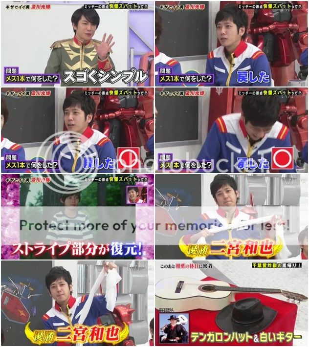 接著是某個VTR quiz,而要門把猜VTR後來會發生的事。大家猜錯,及川桑說答案很簡單的。於是NINO就回答『返回去了。』還真給NINO猜對答案了!!簡直就是quiz小能手嘛你。簡直是亂來胡鬧的舊電視的感覺啊。