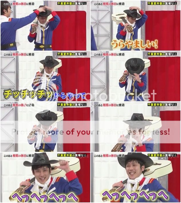 於是就給答對的NINO送上禮物,就是VTR裡看到的主角的道具,一個帽子和一個白色吉他。於是NINO就來模仿了那位主角的經典動作。哈哈哈!好可愛啊!!!!