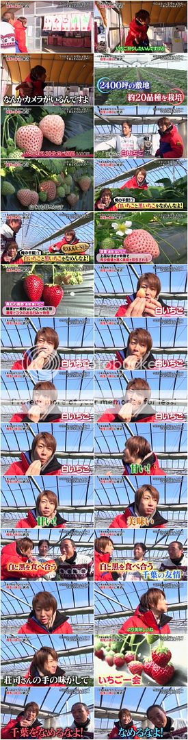 雅紀真的很專業,還說了沒和對方草莓園的人做協調不知道能不能進去拍攝,於是自己自告奮勇的進去做協調,很不好意思的先說明了會有攝影機跟拍,對方竟然很大方的答應了。這個草莓園的收費是半小時1400yen,任你採任你吃啊。好棒啊!草莓園的園長說這裡還有白色的草莓,讓雅紀試吃白色的草莓。看起來就已經好好吃了!!雅紀試吃也是說好甜好好吃。荘士桑試吃了深色(普通我們看到的鮮紅)草莓,後來還和雅紀互相餵食。真是的!!ダメ!!你和人家船長這麼恩愛翔會吃醋的。哈哈哈!!