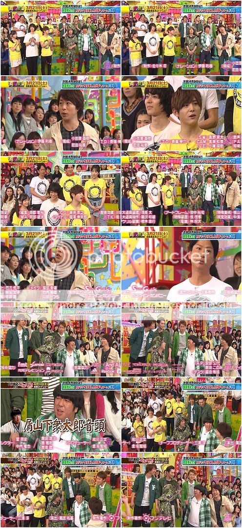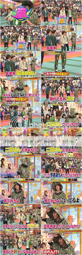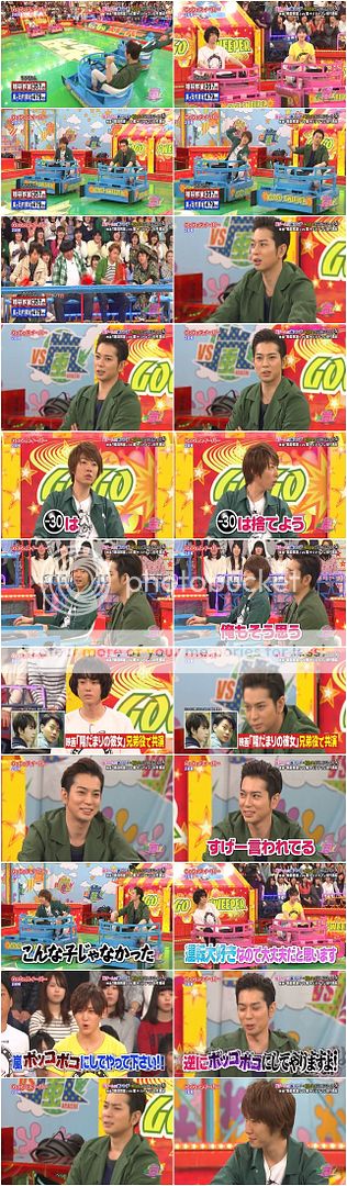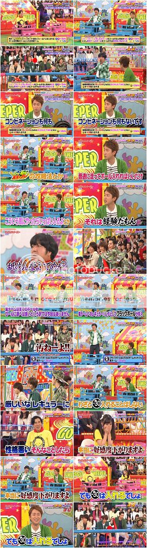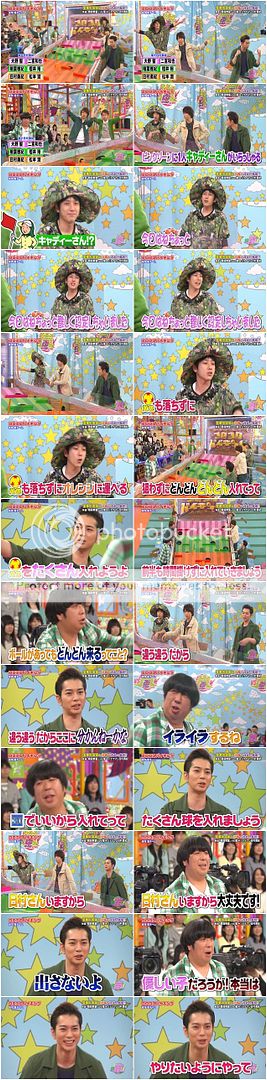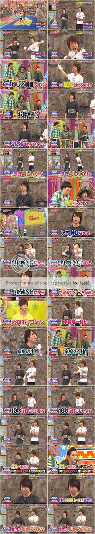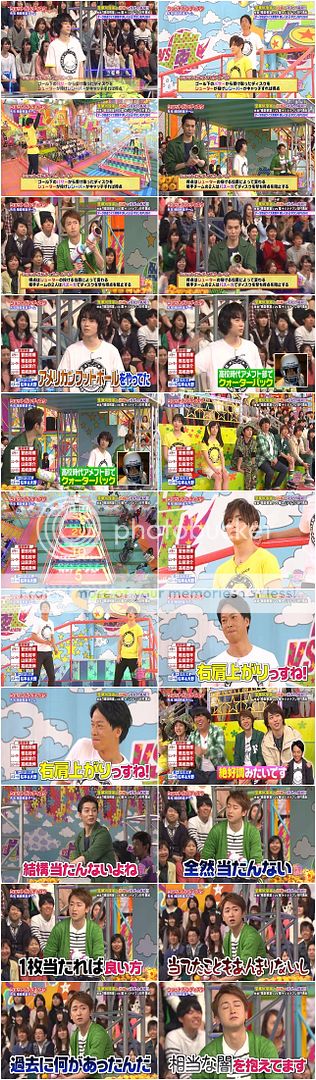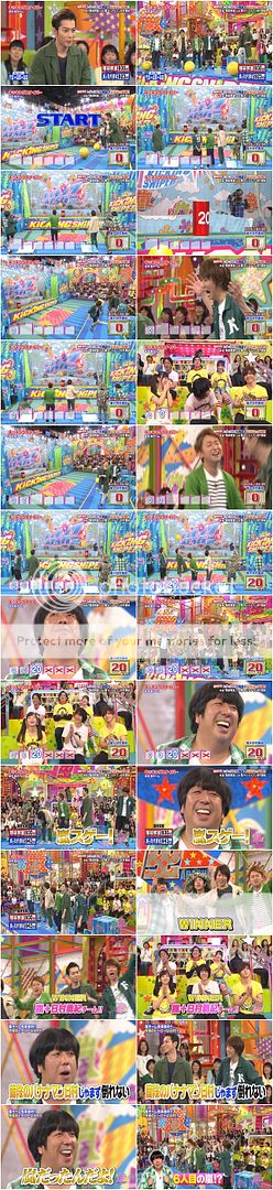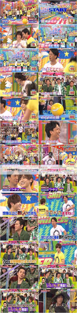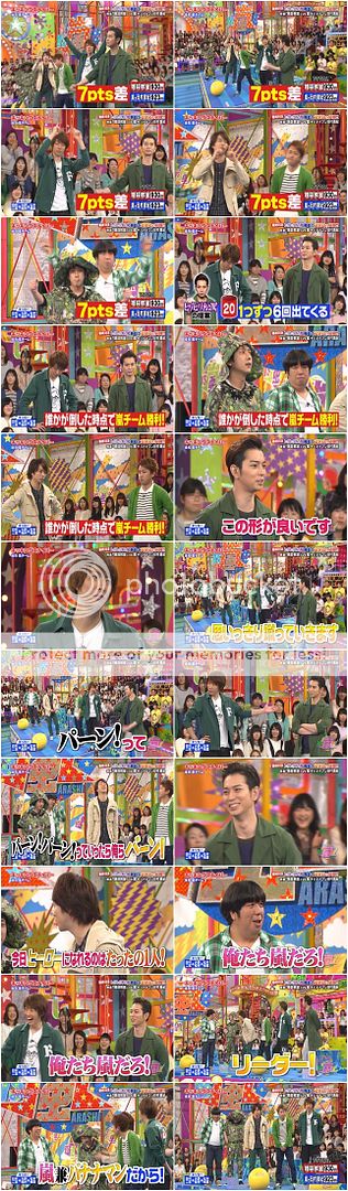 於是嵐隊上場了!!就如J爺說的,6輪全部要來一個瓶子啊!!我說雖然一個瓶子就贏了但是一個瓶子太難了啦!!!模特表示可以想像到J一下就パン解決了。翔於是說那如果真的パン就解決了,我們也パン的立正向你敬禮。所以現在是只要任何一個人踢到了,全員就給他立正敬禮,包括了日村桑。日村桑『所以我也是嵐咯?』翔『利達!!』(喂喂!!你家利達只有一人!!)於是看到全員站在一邊準備要給J爺立正的。