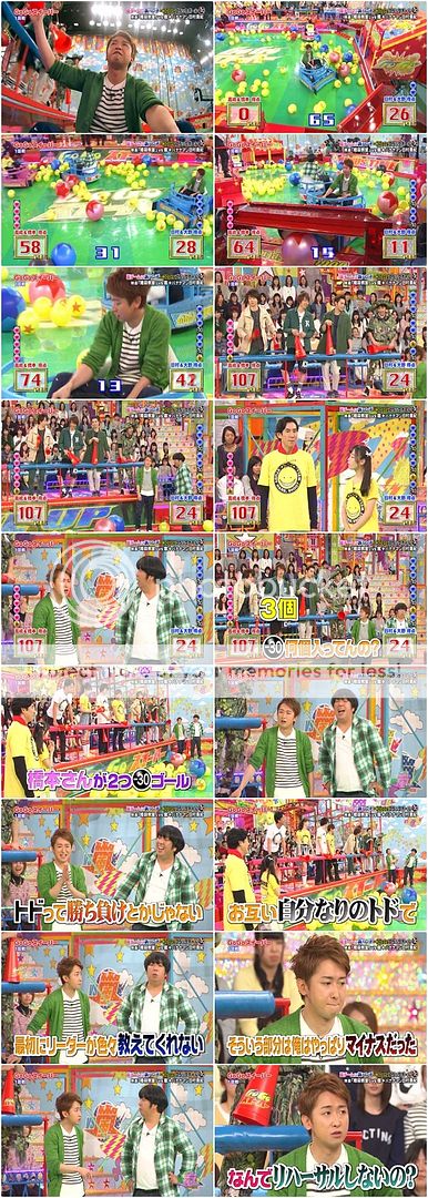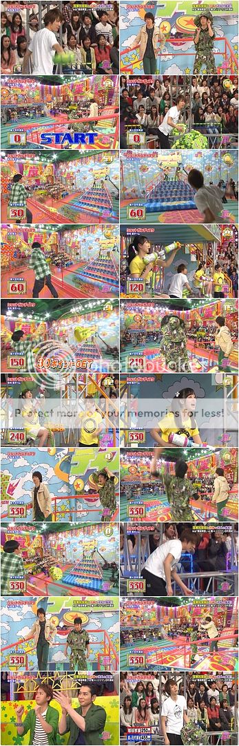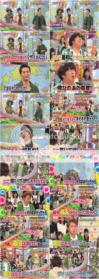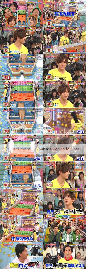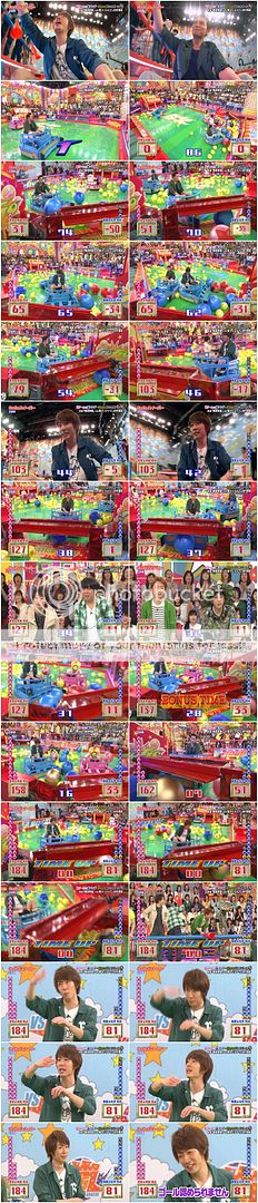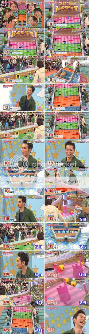 J也掉球了!!!那是因為日村桑你麻煩配合一下J的動作啊!!日村桑太用力了,即使J想阻止球掉下去也沒辦法!櫻葉傳了金色球下去橘色區,但是J那裡太用力又把金色球傳回去給綠色區,還好櫻葉發現了沒掉球啊!!真是危ない啊!!!金色球順利掉進50分格子了!做的好!瞬間黃色小球就掉下來了,這次很不錯啊,傳了不少的球下去綠色區,至少沒像上週那樣瞬間消失。後來看到兩顆小球卡在了縫縫那裡,就掉下去了。果然不行啊!!球太小太難了!最後得分125。